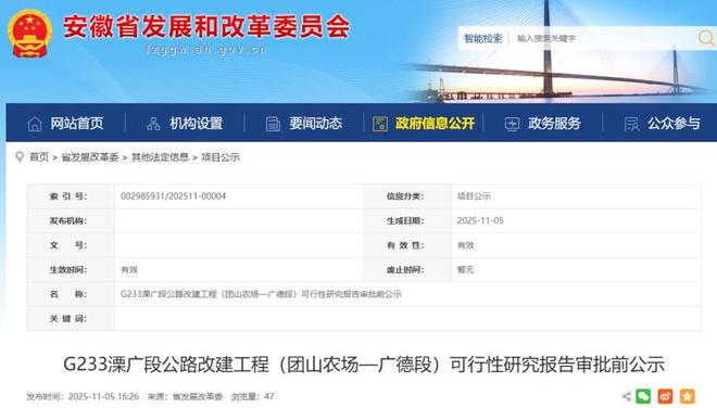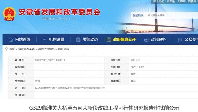 现将G329临淮关大桥至五河大新段改线工程可行性研究报告审批内容予以公示。公示时间自公示之日起10个工作日(11月7日—11月20日),如有意见和建议,请以来人或署名来信(包括电子信函)方式向省发展改革委基础设施发展处反映,并提供姓名及联系电话,对匿名方式提出异议的不予受理。