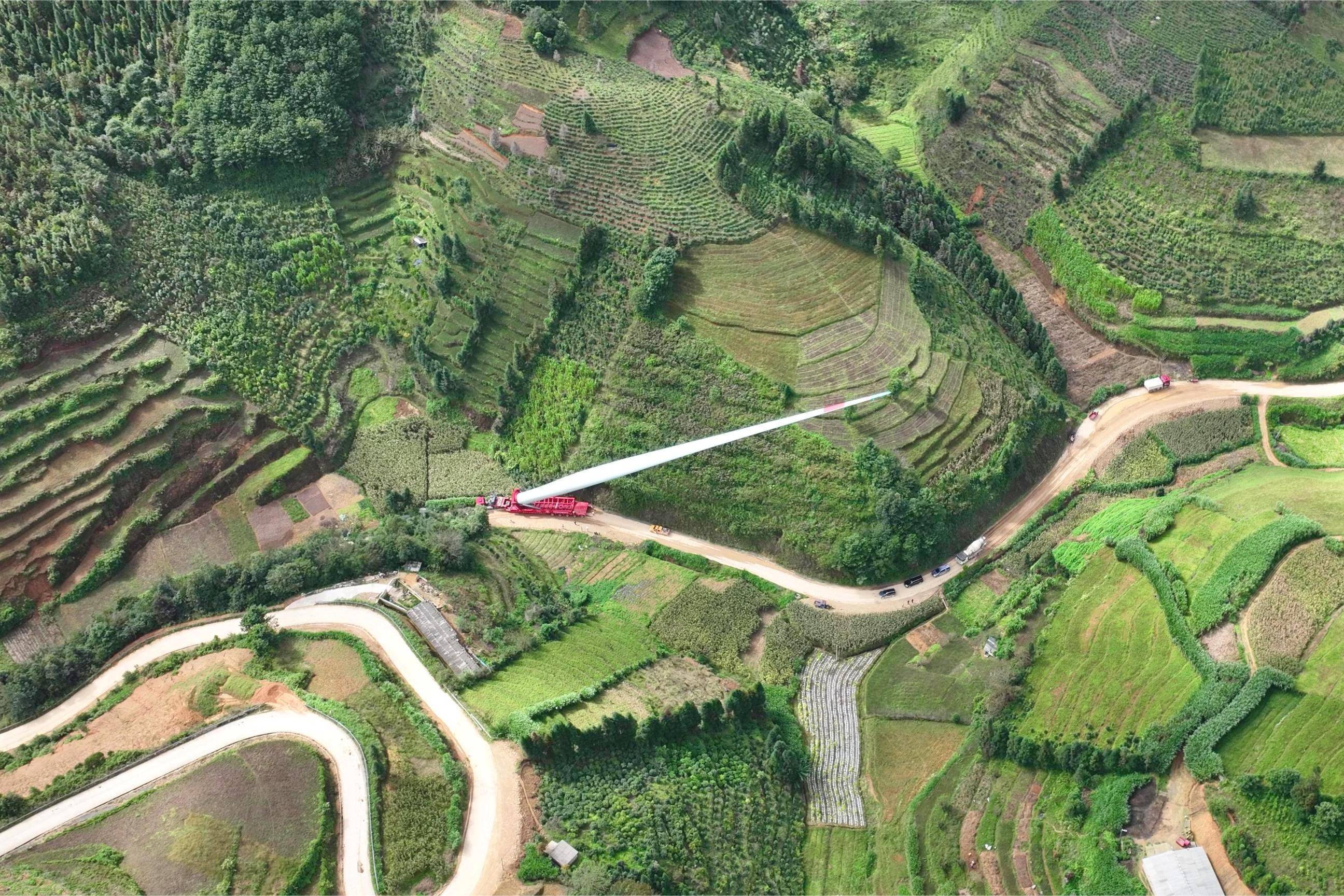 2025年12月,朱永福和项目团队在协调跨区域运输相关工作时,面临弯道转弯难度大、场区山区路况复杂、叶片质地脆弱易损等诸多难点。108米长的风电叶片重达35吨,最大扬举角度超过30度。